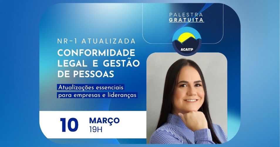 No dia 10/03, às 19h, Rita Faria estará na sede da ACAITP com a palestra gratuita “NR-1 Atualizada – Conformidade Legal e Gestão de Pessoas”.